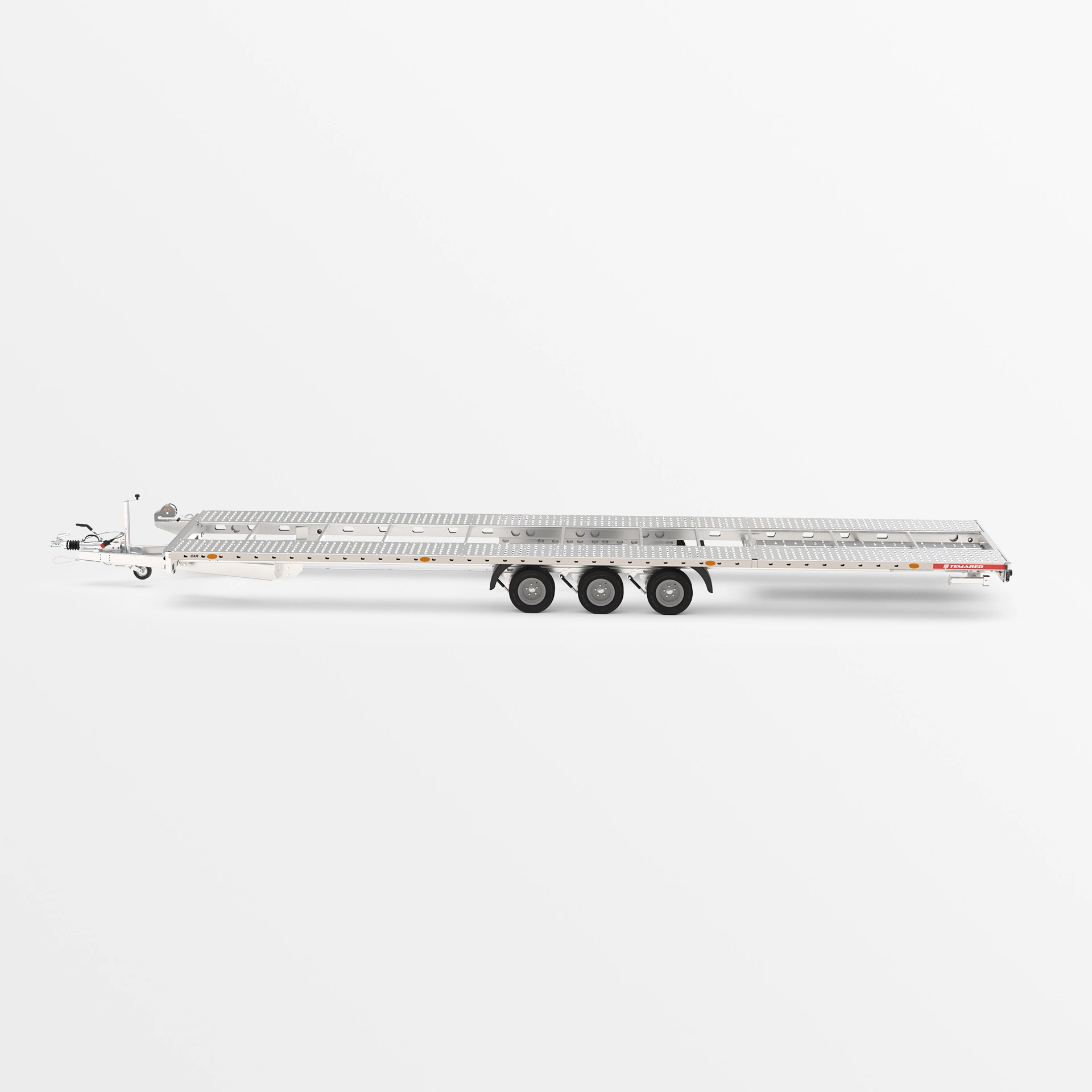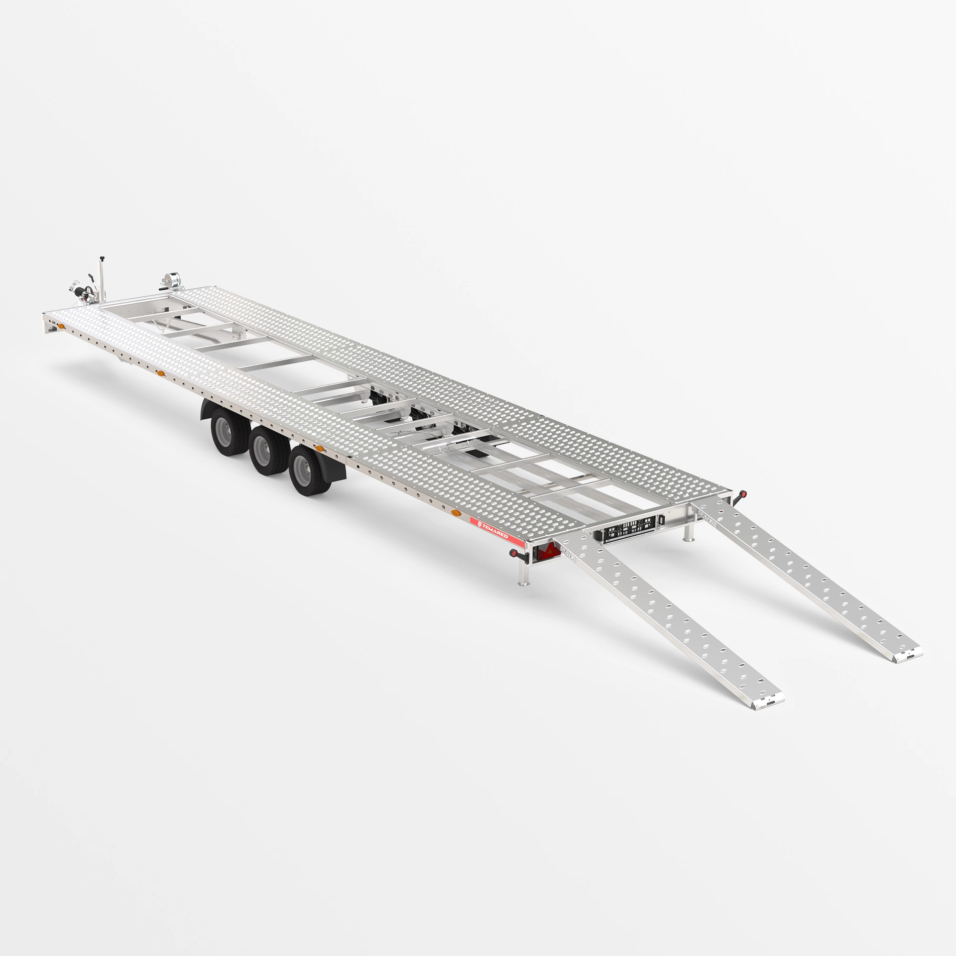 Remorcă pentru transportul autovehiculelor cu șasiu sudat solid. Echipată cu canal de trecere, rampe din oțel ascunse sub platforma de încărcare și suport troliu montabil pe stânga sau dreapta.