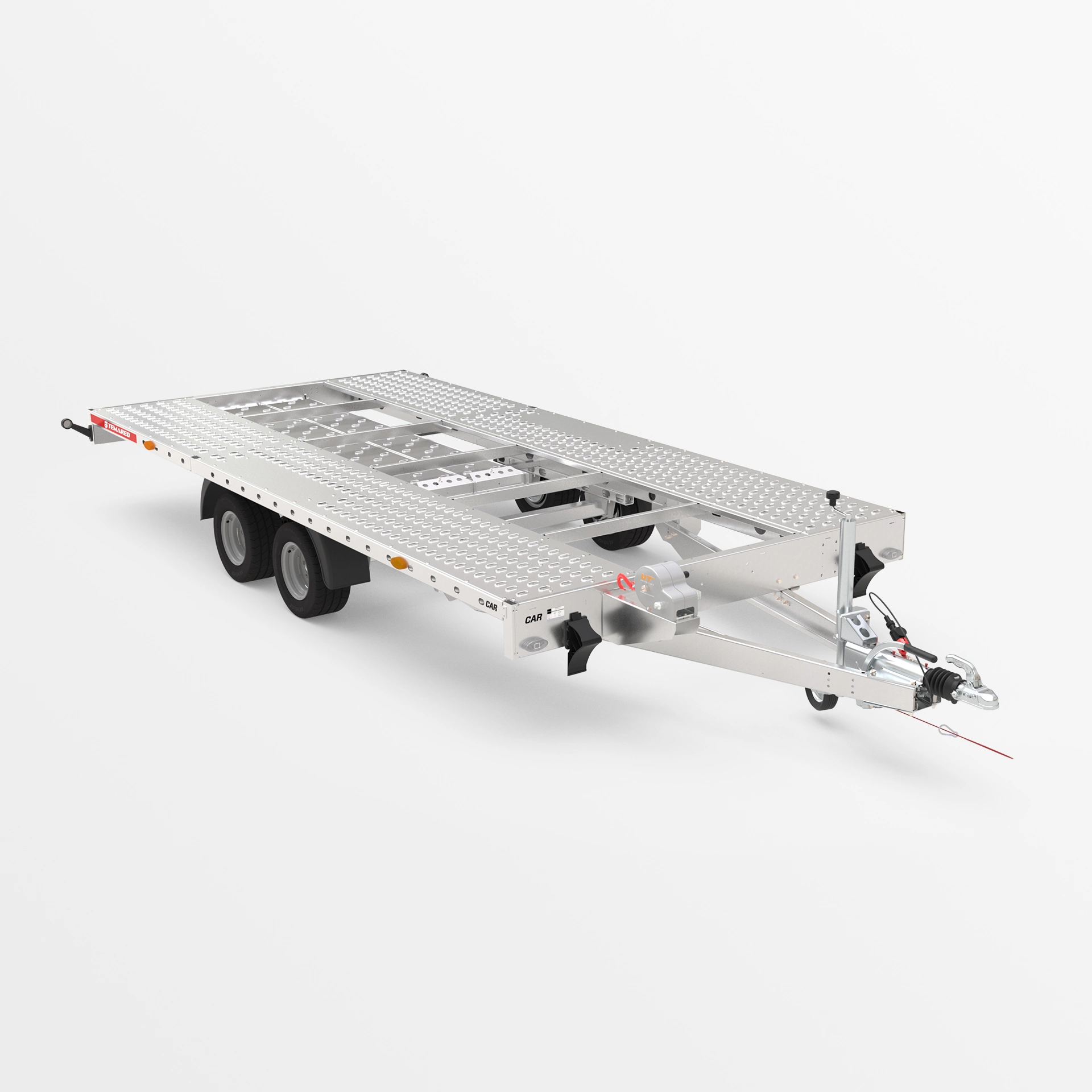 Remorcă pentru transportul autovehiculelor cu construcție solidă sudată. Echipată cu roată de sprijin automată, troliu pentru încărcare mai ușoară, rampe din oțel, blocatoare pentru roți și multiple puncte de ancorare.