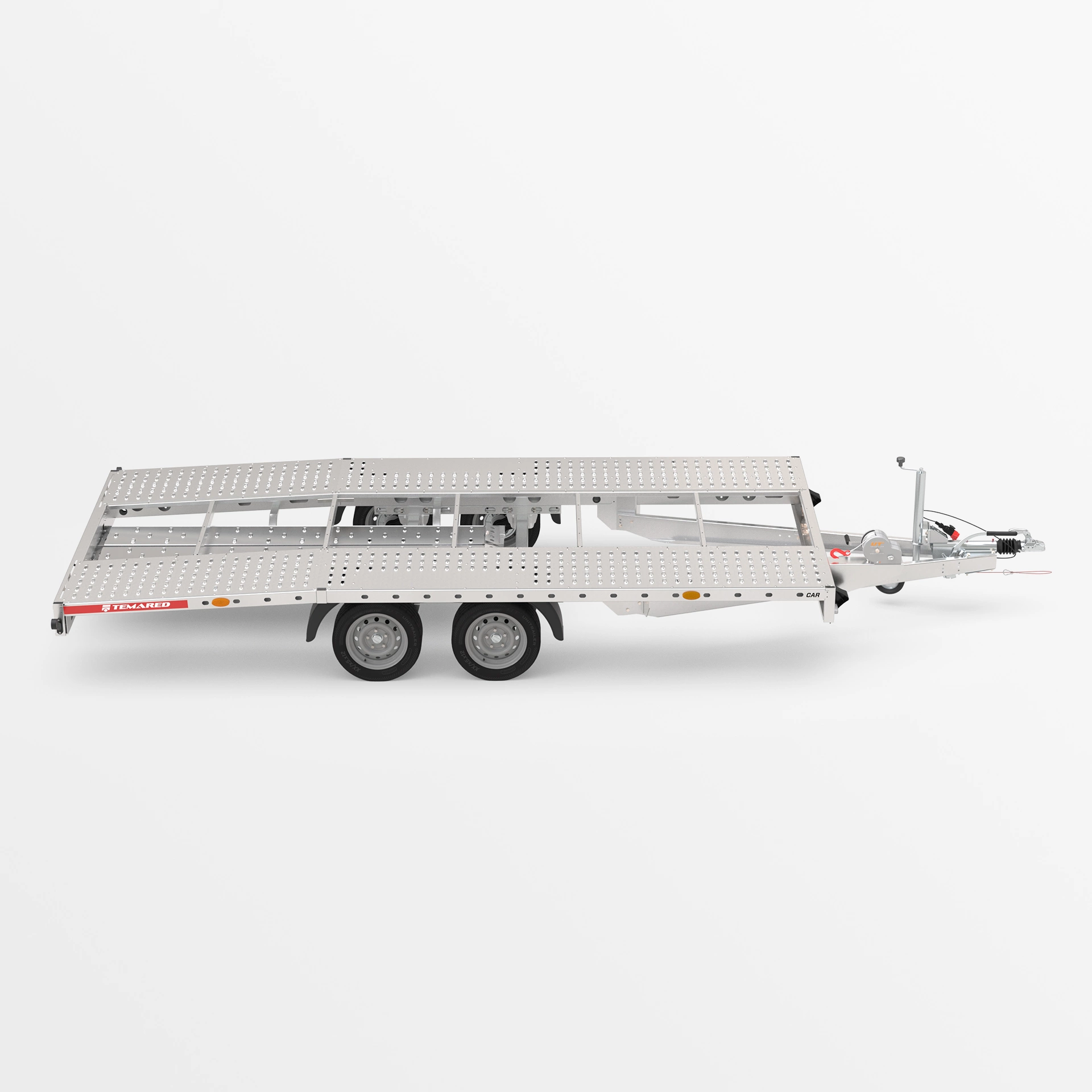 Remorcă pentru transportul autovehiculelor cu construcție solidă sudată. Echipată cu roată de sprijin automată, troliu pentru încărcare mai ușoară, rampe din oțel, blocatoare pentru roți și multiple puncte de ancorare.