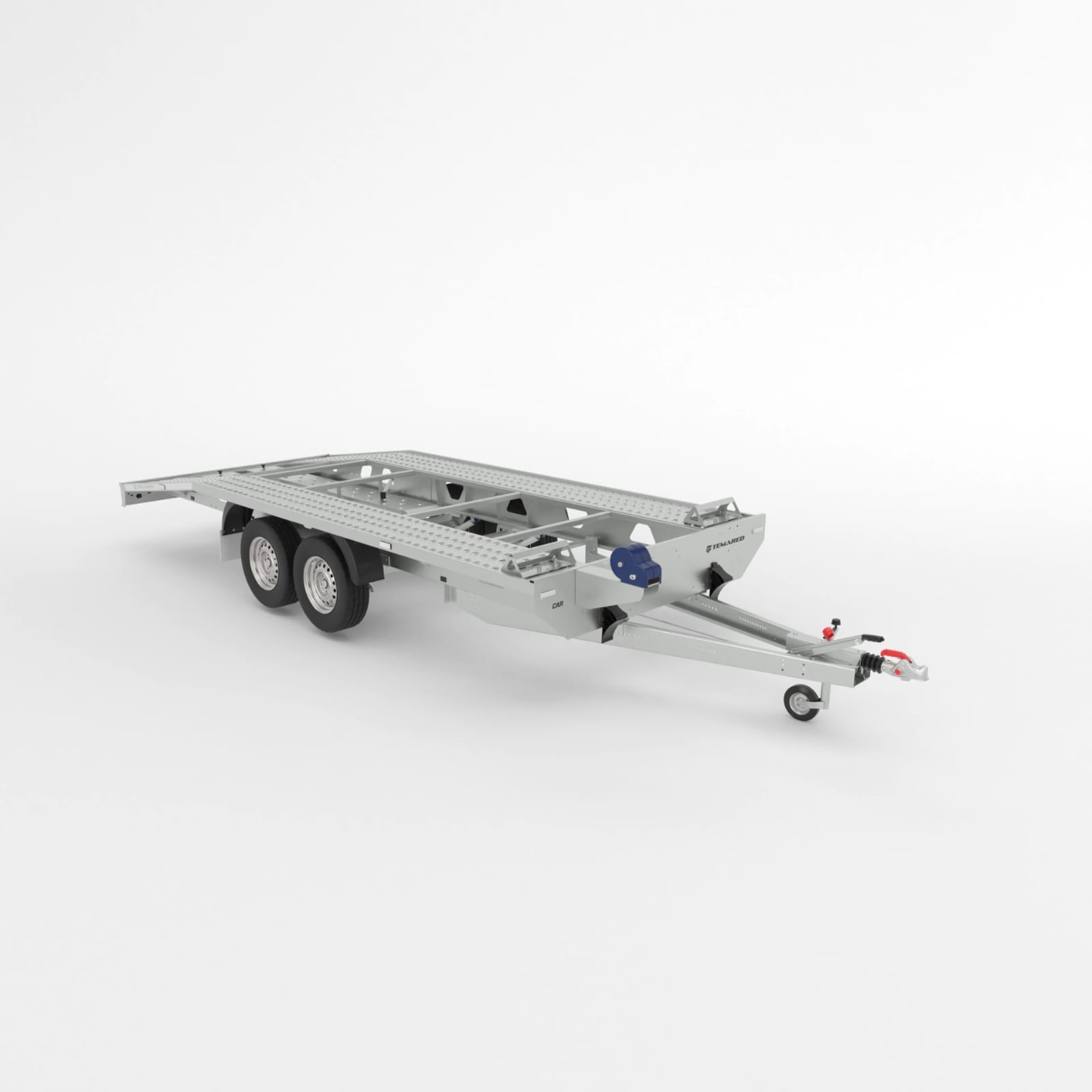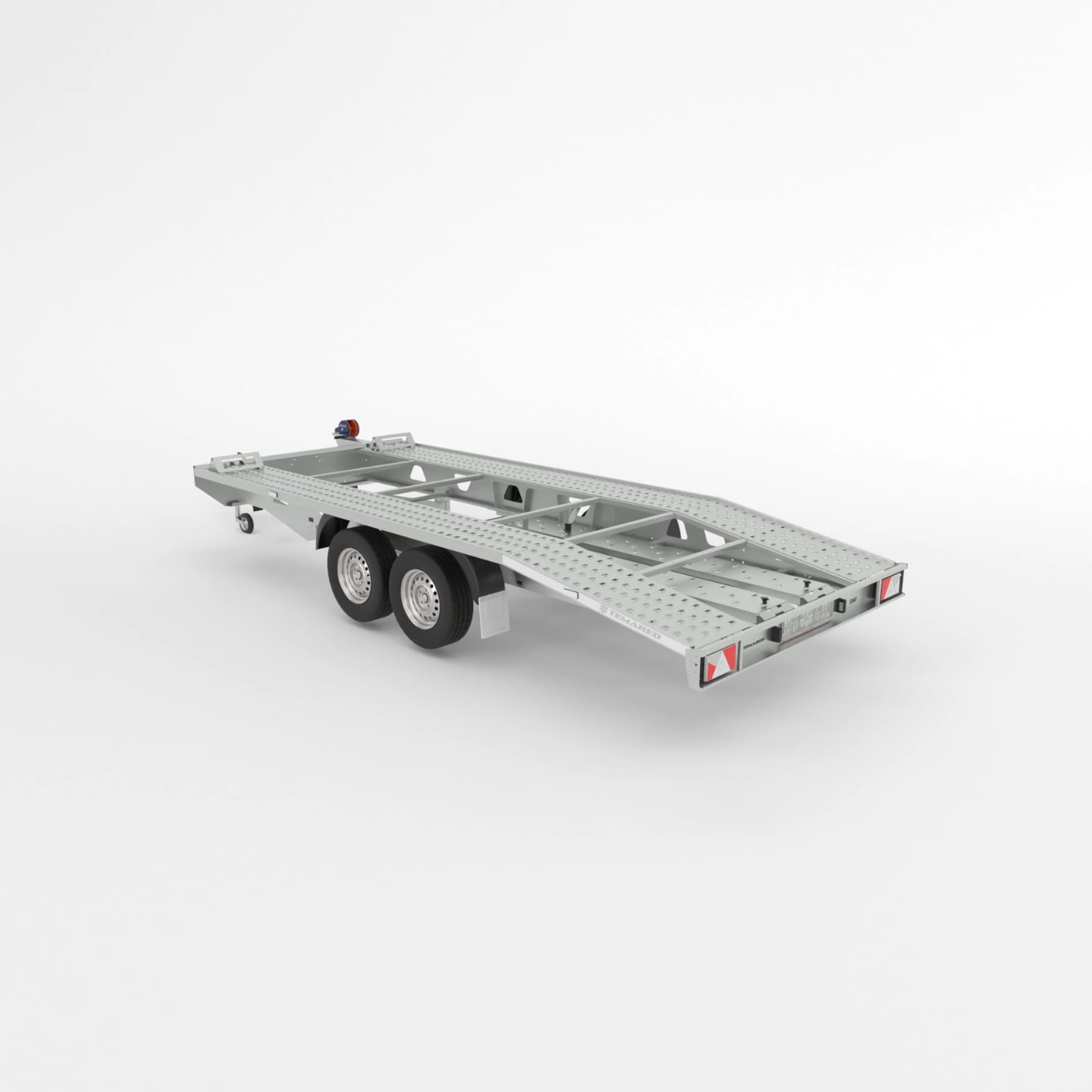 Remorcă pentru transportul vehiculelor cu o construcție solidă sudată. Echipată cu o roată de sprijin automată, numeroase puncte de ancorare, un troliu pentru încărcare mai ușoară, rampe din oțel, blocatoare din otel și pene de siguranță pentru roți.