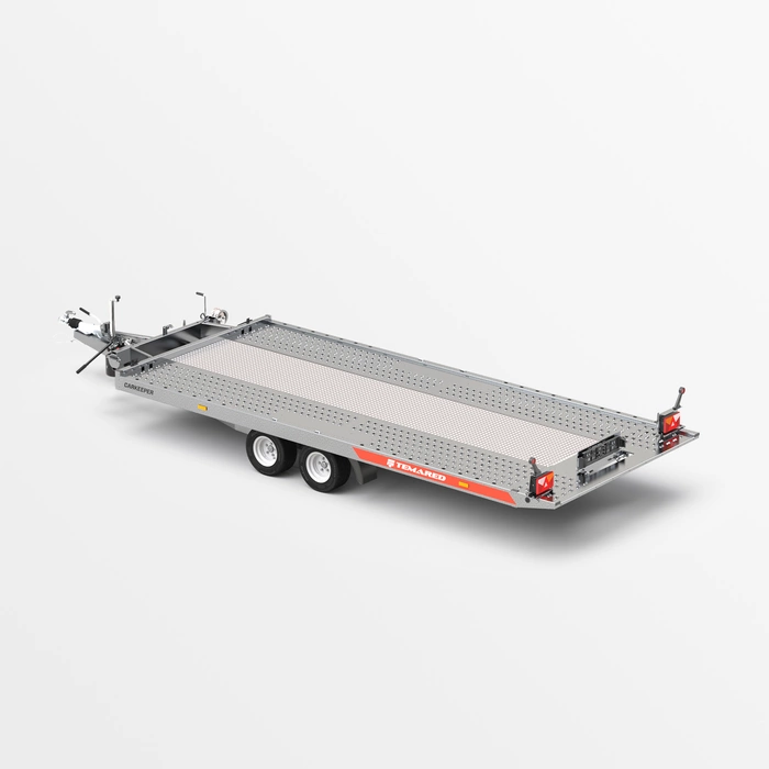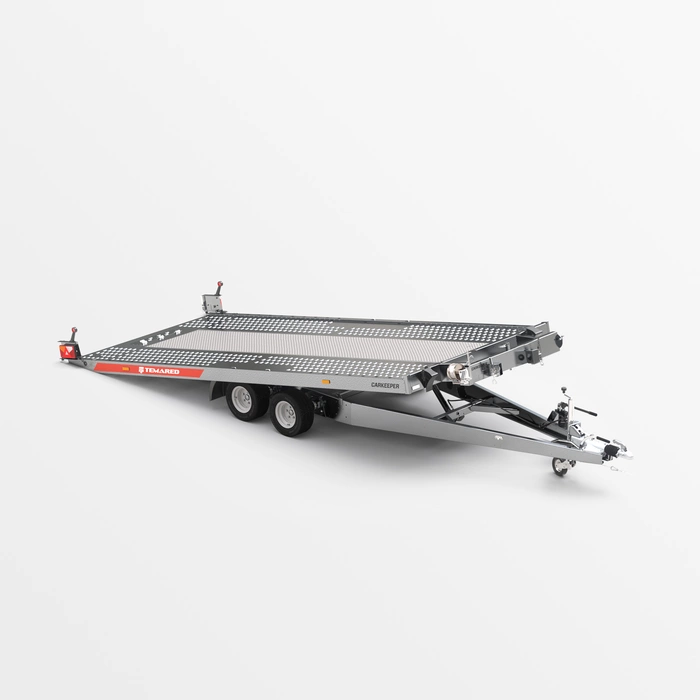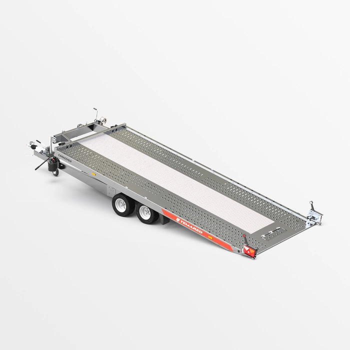 Remorca camionului este echipată cu funcția de înclinare a suprafeței de transport. Cilindrul hidraulic utilizat asigură o funcționare lină și ușoară în timpul încărcării. Unghiul de coborâre redus de 11° facilitează încărcarea vehiculelor cu gardă la sol redusă. Un cadru robust realizat din profile închise și un boghiu și o bară de tractare ranforsate asigură siguranță și durabilitate. Grinzile laterale cu găuri și podeaua din tablă Lohr, datorită deschiderilor dense distanțate, facilitează fixarea vehiculelor transportate. Numeroase variante de configurații de umplutură, cum ar fi tabla ondulată din aluminiu pe placaj, tabla ondulată din aluminiu sau panoul de aluminiu, permit personalizarea remorcii în funcție de cerințele individuale. Opțional, remorca poate fi echipată cu iluminare completă cu LED. Este soluția ideală pentru companiile care caută echipamente fiabile pentru transportul auto.