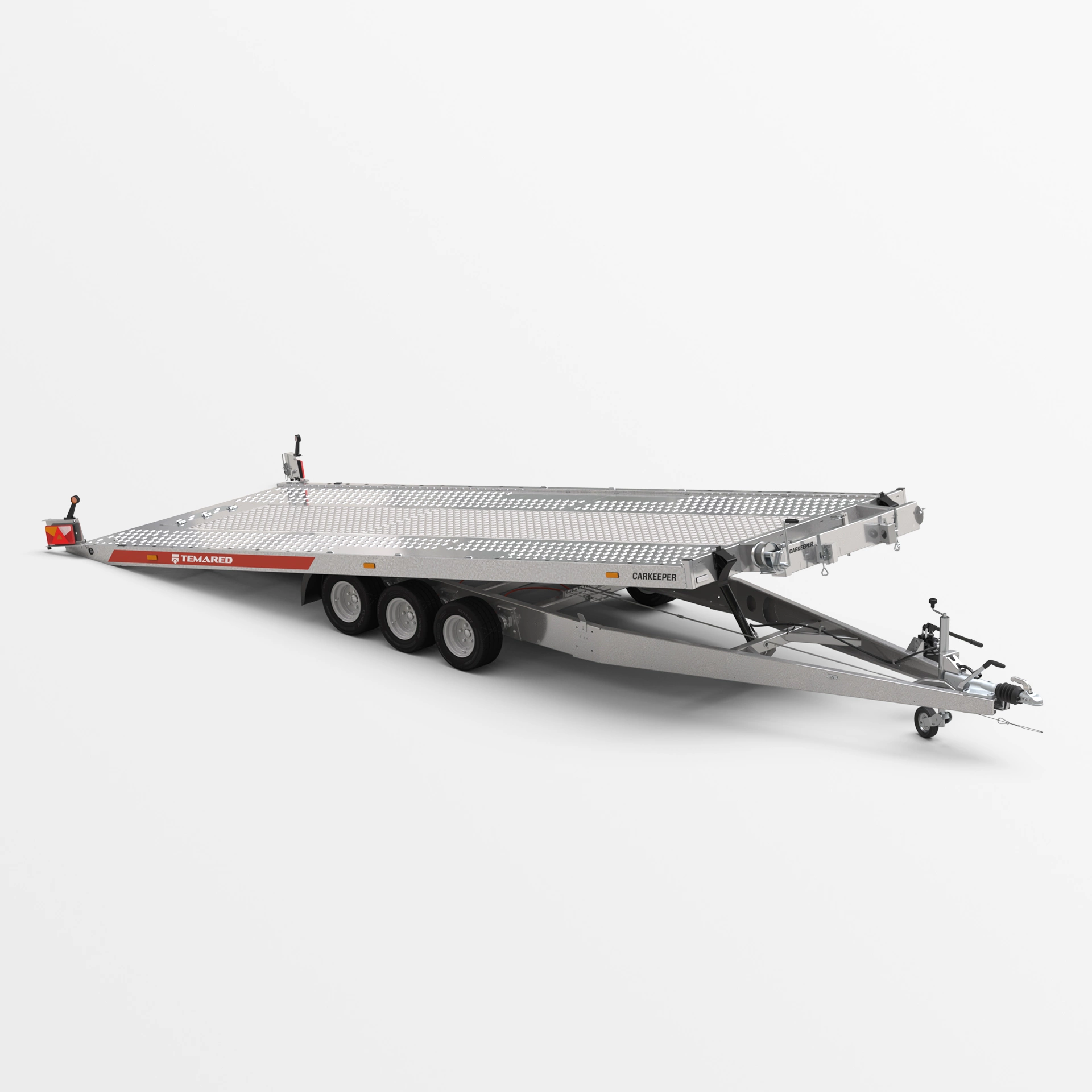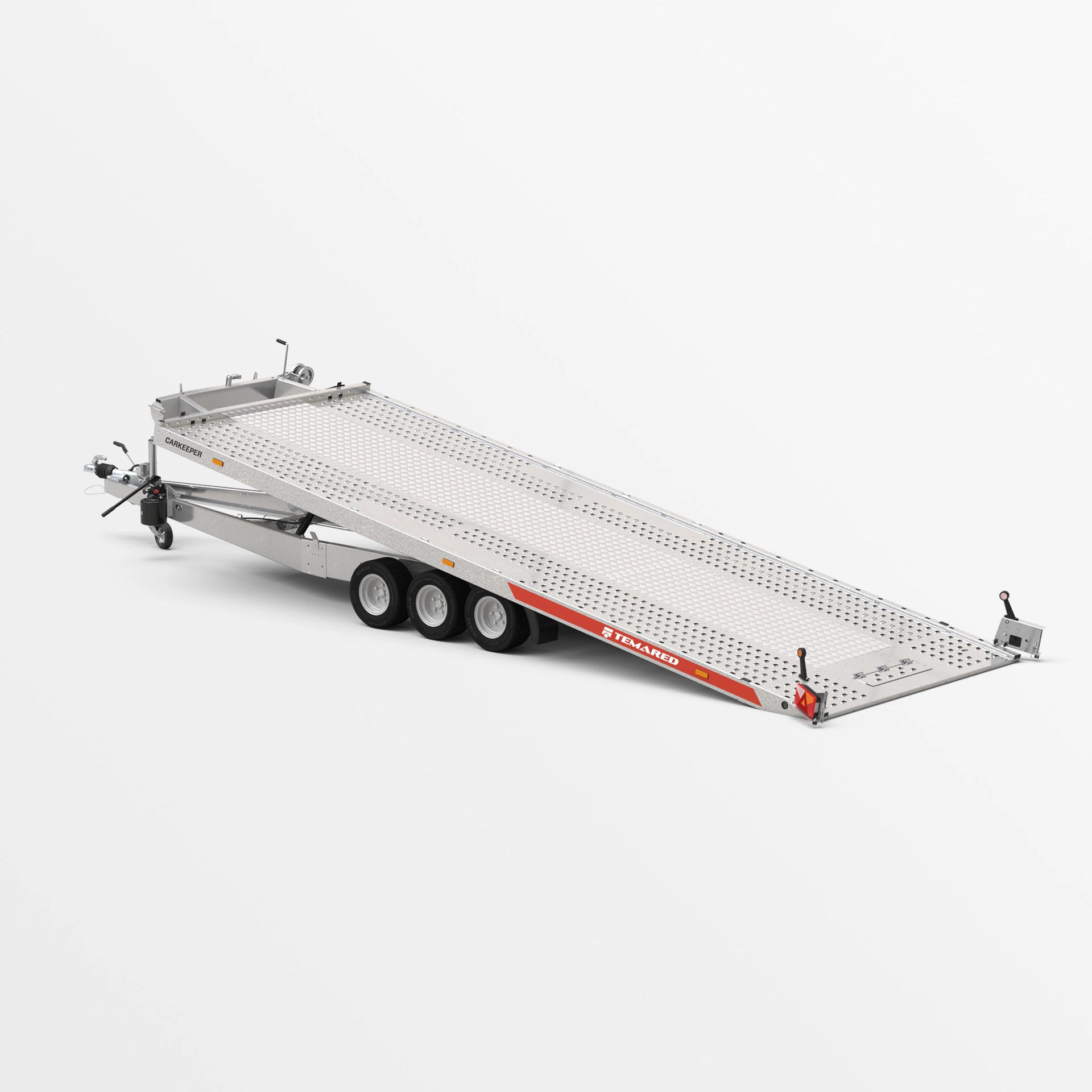 Remorcă cu platformă basculantă pentru vehicule, cilindru hidraulic pentru operare ușoară. Unghi de descărcare 11°. Cadru robust, punte și șasiu întărite. Podea Lohr cu găuri pentru fixarea vehiculelor. Diverse variante de închidere: aluminiu pe placaj, aluminiu complet sau panou aluminiu. Opțional: LED complet.