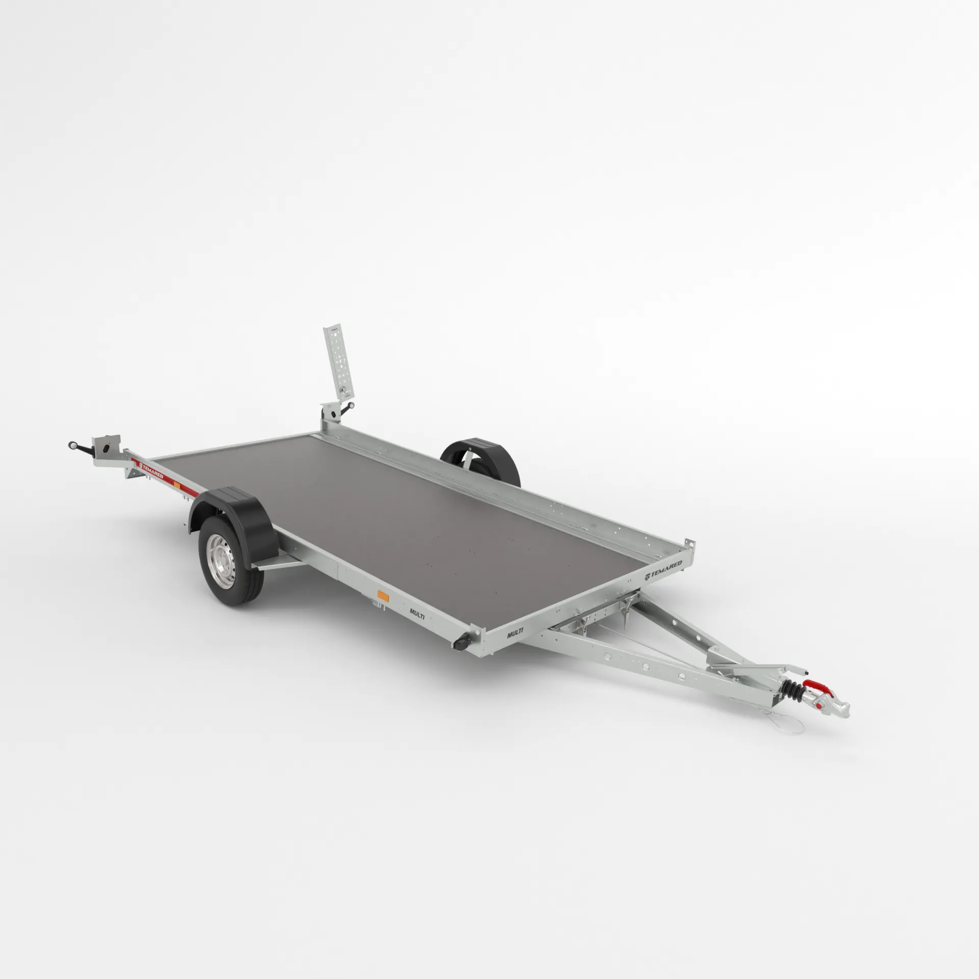 Platforma de transport universala cu timon basculabil, destinata transportului de motociclete, ATV-uri si alte vehicule de dimensiuni reduse. Constructia este realizata din profile de otel galvanizat imbinate prin suruburi, iar podeaua este din placaj antiderapant si impermeabil, conceputa pentru utilizare intensiva.
